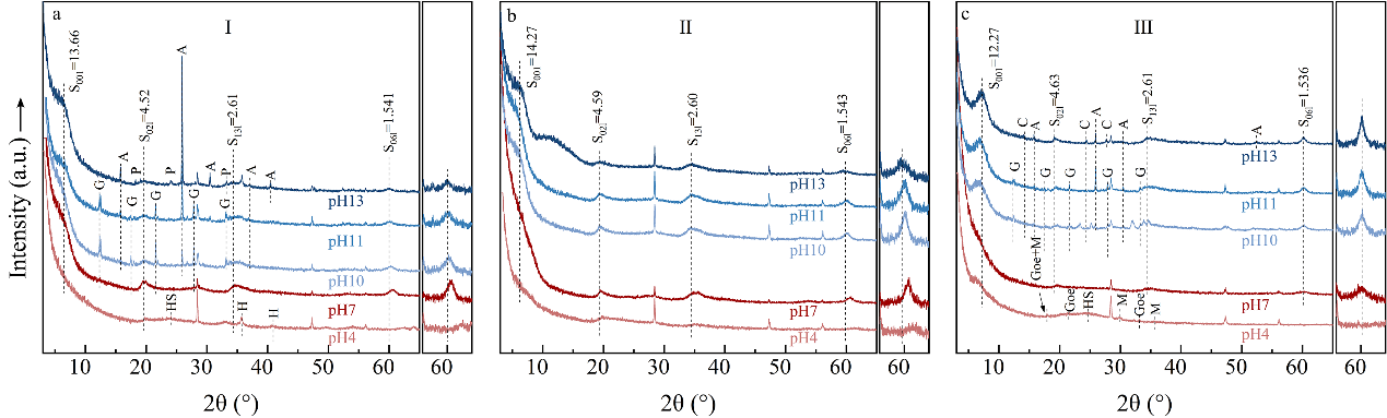 ?在酸性條件下,Al優(yōu)先占據(jù)蒙皂石晶格,進(jìn)而調(diào)控Fe是以類質(zhì)同象形式進(jìn)入蒙皂石結(jié)構(gòu),還是獨(dú)立形成赤鐵礦、針鐵礦等氧化物。在氧化性酸性環(huán)境中,蒙皂石內(nèi)Fe/Mg比值升高,其晶體學(xué)上表現(xiàn)為(06l)晶面間距隨pH升高而增大(圖4)。該趨勢(shì)與火星遙感數(shù)據(jù)結(jié)果中蒙皂石普遍呈現(xiàn)高Fe/Mg比的現(xiàn)象高度吻合,為理解火星蒙皂石與母巖成分之間的分異機(jī)制提供了實(shí)驗(yàn)依據(jù)。