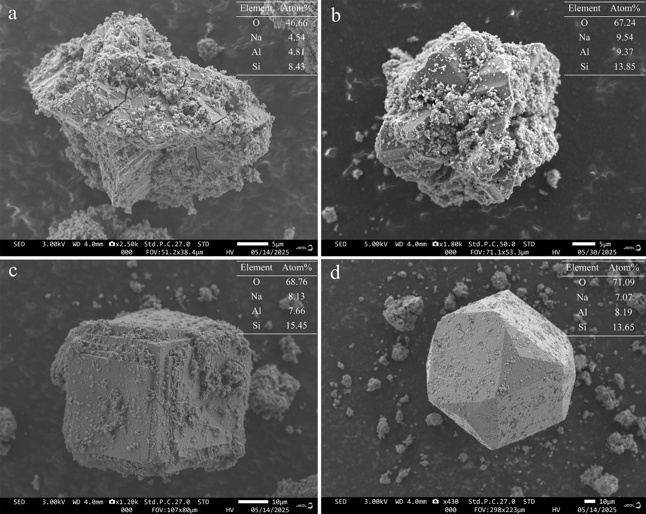 圖2. 幾種沸石的掃描電鏡圖(a.戈沸石;b.十字沸石;c和d.方沸石)
