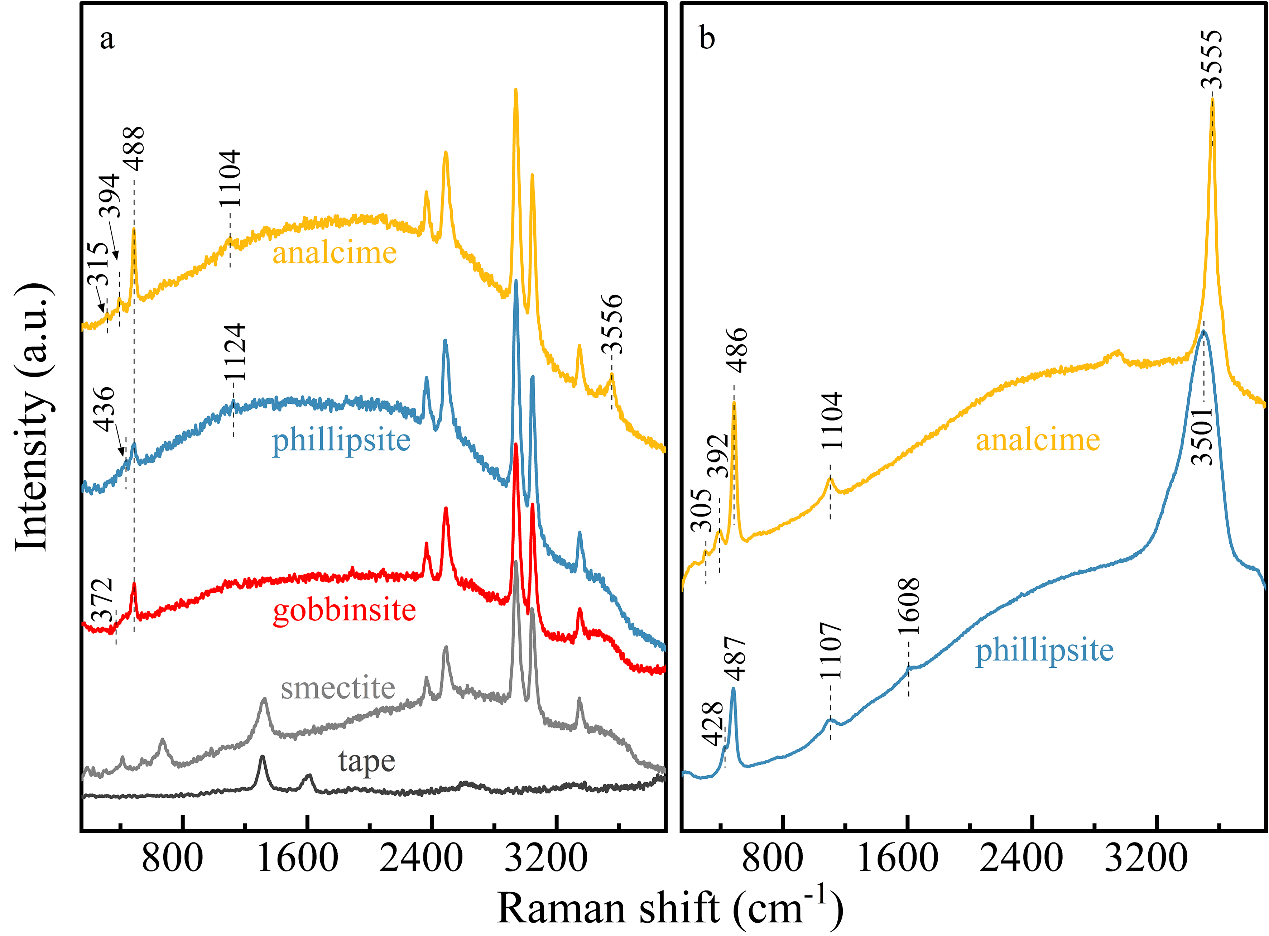 ?隨著環(huán)境pH值由中性向強(qiáng)堿性升高,共生礦物呈現(xiàn)清晰的演化序列:蒙皂石→蒙皂石+戈沸石(gobbinsite)+方沸石(立方體)→蒙皂石+十字沸石(phillipsite)+方沸石(立方體和四角三八面體聚型)(圖1,2)。針對(duì)火星探測(cè)中沸石識(shí)別難度大的問題,本研究指出拉曼光譜能通過(guò)識(shí)別硅氧骨架中T-O-T對(duì)稱彎曲振動(dòng)模式(圖3),有效彌補(bǔ)可見光-近紅外反射光譜(VNIR)在該類礦物鑒定上的不足。
